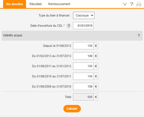 En fonction de la date d'ouverture du Compte d'épargne logement (CEL) et des intérêts acquis sur les périodes passées, ce simulateur calcule le taux d'intérêt correspondant et fournit, pour chaque durée, le montant maximum qu'il est possible d'emprunter.