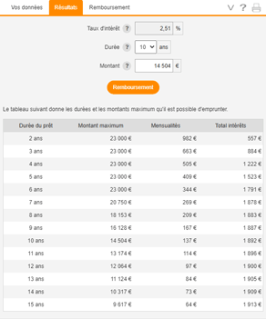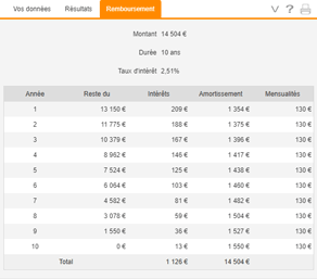 Le simulateur CEL présente également le tableau d'amortissement du prêt.