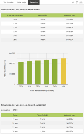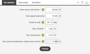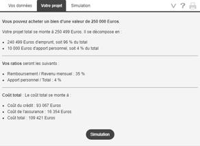 A partir de vos revenus et de votre apport personnel, vous visualisez le montant total et des résultats sous forme graphique et chiffrée.